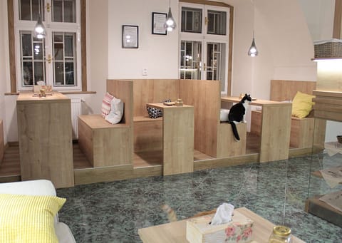 Kočky, které tu mohou zákazníci vidět, jsou přátelské a sociální, takže se každý den těší, nikdy se nestává, že by se nechtěly zapojit do chodu kavárny. Schovávají se jen tehdy, když je někdo otravuje, k tomu jim slouží ona místnost s pelíšky.