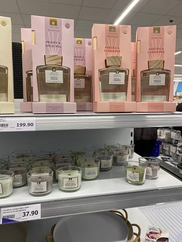 Voňavý sektor tvoří difuzéry a svíčky s dřevěným knotem, které slibují dobu hoření až 15 hodin. K dispozici jsou vůně jako zelený čaj & bavlna, fík & cedrové dřevo, santalové dřevo & pižmo. Škoda jen, že nejsou na výběr svíčky ze sójového vosku, ty totiž nejsou oproti těm parafínovým toxické.